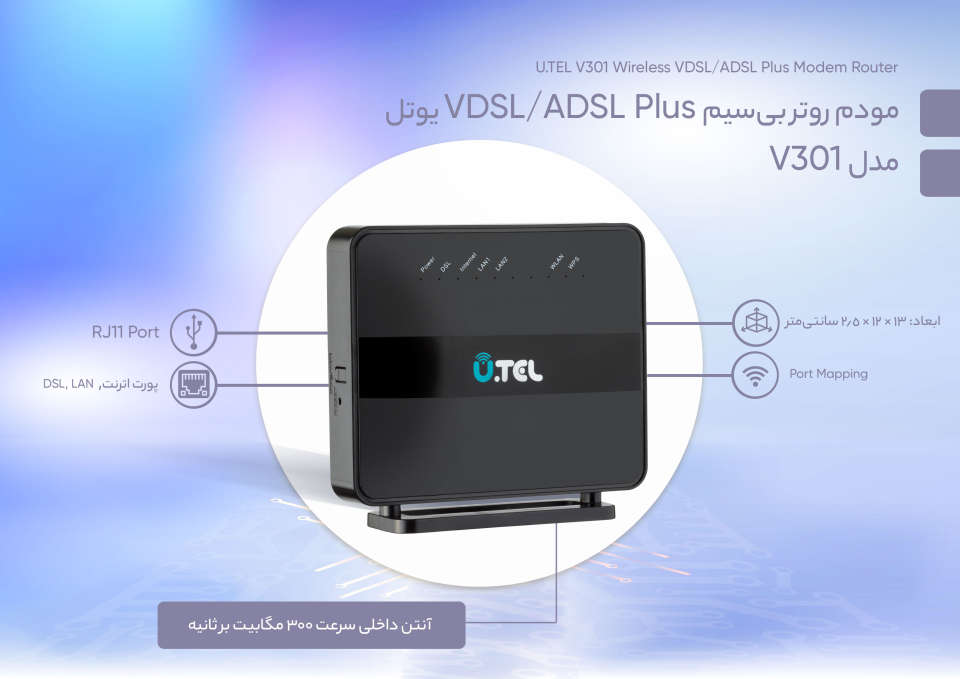 مودم روتر V301 محصولی از شرکت یو.تل است که در ابعاد 13 × 12 × 2.5 سانتی متر تولید و روانه بازار شده است. در قسمت جلوی دستگاه دارای نشانگر LED برای نمایش وضعیت روشن یا خاموش بودن و اتصال پورتهای دیگر است. در قسمت پشت این محصول، دو درگاه برای اتصال کابل LAN و یک درگاه برای اتصال کابل تلفن قرار گرفته است. همچنین یک درگاه برای اتصال آداپتور 12 ولتی این محصول هم تعبیه شده است. این مودم از طریق رابط کاربری تحت وب، امکان تنظیمات پیشرفته مودم و ارتباطی امن را به مشترک میدهد و با دارا بودن آنتن داخلی سرعت 300 مگابیت بر ثانیه در ارتباطات بی سیم را فراهم میسازد. به طور کلی مودم V301 برای اشتراک گذاری اینترنت پرسرعت در مصارف خانگی و شرکتها طراحی شده است و با بهکارگیری استاندارها و قابلیتهای کلیدی انتخابی ایدئال به حساب میآید.